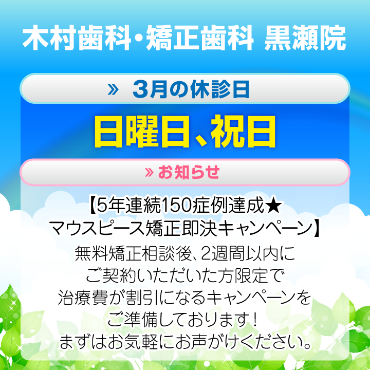 3月休診日情報|東広島市の歯医者|木村歯科・矯正歯科(黒瀬院)